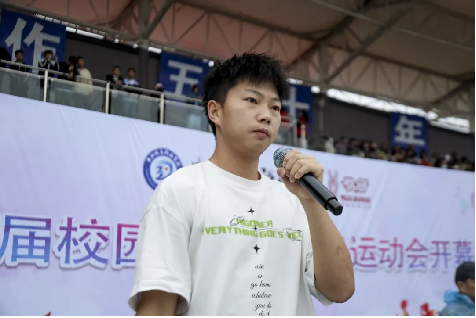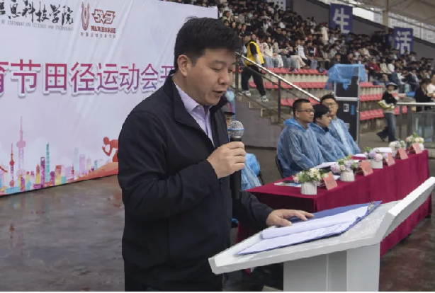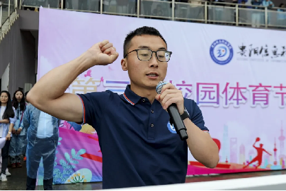 饶斌华致开幕词,他强调了体育对于学生全面发展的重要意义,对本次体育节的成功举办表达了殷切期望。他表示,体育节的举办,是伟德官网深入贯彻落实习近平总书记关于爱国卫生运动的重要指示精神重要举措,同时是提高伟德官网师生健康水平、卫生文明素养、共建健康的校园环境,促进学生德智体美劳全面发展重要途径。饶斌华向在场师生提出了四点希望:一是希望全体同学,运动员和裁判员尊重规则,赛出贵科人的风格;二是希望裁判员以严谨公正的态度做好裁判工作;三是希望相关工作人员各司其职,为选手们做好后勤保障;四是希望各位同学增强安全意识,做文明观众。