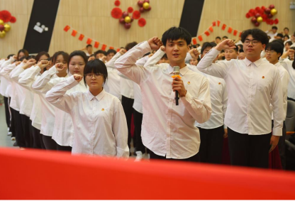 会上,新团员举行了庄重的入团仪式。140名新团员面对鲜艳团旗,举起右手庄严宣誓:“我志愿加入中国共产主义青年团,坚决拥护中国共产党的领导,遵守团的章程……为共产主义而奋斗。”青春誓言、高昂雄浑,表达了同学们对加入共青团组织的激情与自豪。机自2302班宋宏成同学作为新团员代表发言,他表示:“作为一名新团员,我深知自己的责任和使命,在今后的工作和学习中,我将始终保持对团组织的热爱和忠诚,始终保持为人民服务的初心和使命,始终保持团结协作、共同奋斗的精神状态,在担当中历练、在尽责中成长、在奋斗中绽放!
