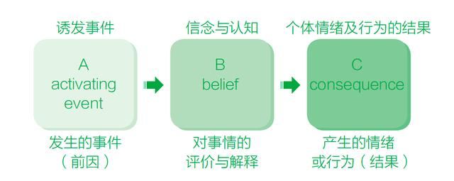 外界刺激事件A,通过中间过程运作的机制(就是我们脑海当中对事件产生的信念B),产生了不一样的情绪及行为后果C。因此,如果信念B没有改变,我们的行为是不会发生改变的。
