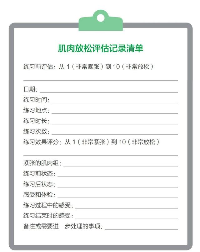 你可以参考使用“肌肉放松评估记录清单”,它能帮助你更好地回顾训练效果: