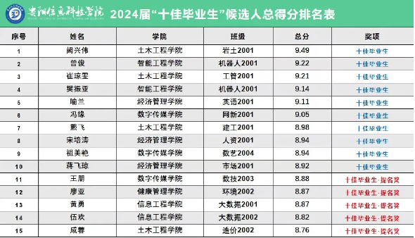 经教师和学生组成的评委团给每位候选人现场打分,综合网络投票分,最终评选出阙兴伟、曾俊、崔琼雯、樊振亚、喻兰、冯缘、熊飞、宋培涛、祖美艳、蒋飞琼十名同学获得2024届“十佳毕业生”荣誉称号;王朋、廖亚、黄勇、伍欢、成蓉五名同学获得2024届“十佳毕业生”提名奖。