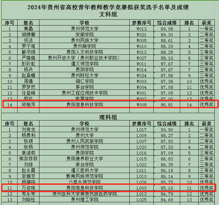 6月20日下午,2024年贵州省高校青年教师教学竞赛在贵州师范大学圆满落幕。据悉,此次竞赛共有全省69所高校、8所附属医院的235名选手参加了此次省级竞赛。伟德官网选派的4位参赛教师中,经济管理学院邱艳萍老师荣获文科组优秀奖,公共教学部万俊桃老师荣获理科组优秀奖。这两项荣誉的取得,标志着伟德官网青年教师在贵州省青年教师教学竞赛的历史上实现了零的突破,展现了伟德官网深化教育教学改革、加强课程建设的显著成效。