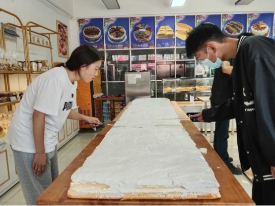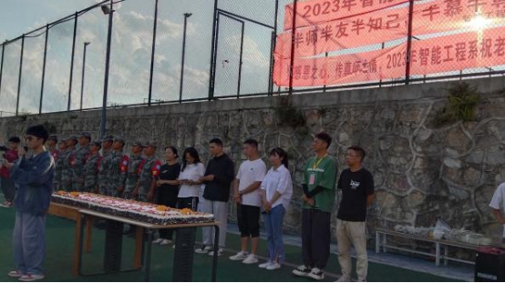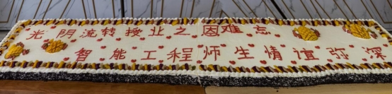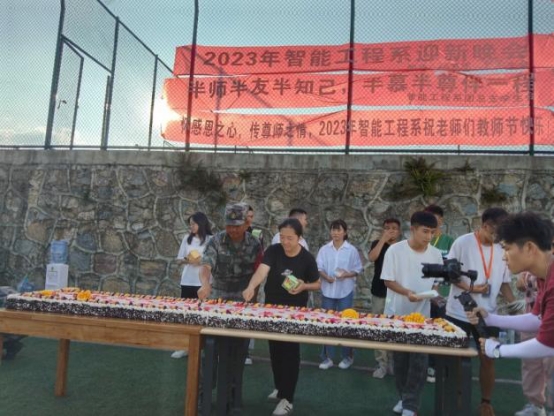 随后智能系学生会还为老师、教官和学生们特别定制了一个写着“光阴流转,授业之恩难忘。智能工程,师生情谊弥深”的大蛋糕。并由卓莉老师和王刚教官为同学们分蛋糕。蛋糕还表达了智能系学子对教师们的感恩之情。