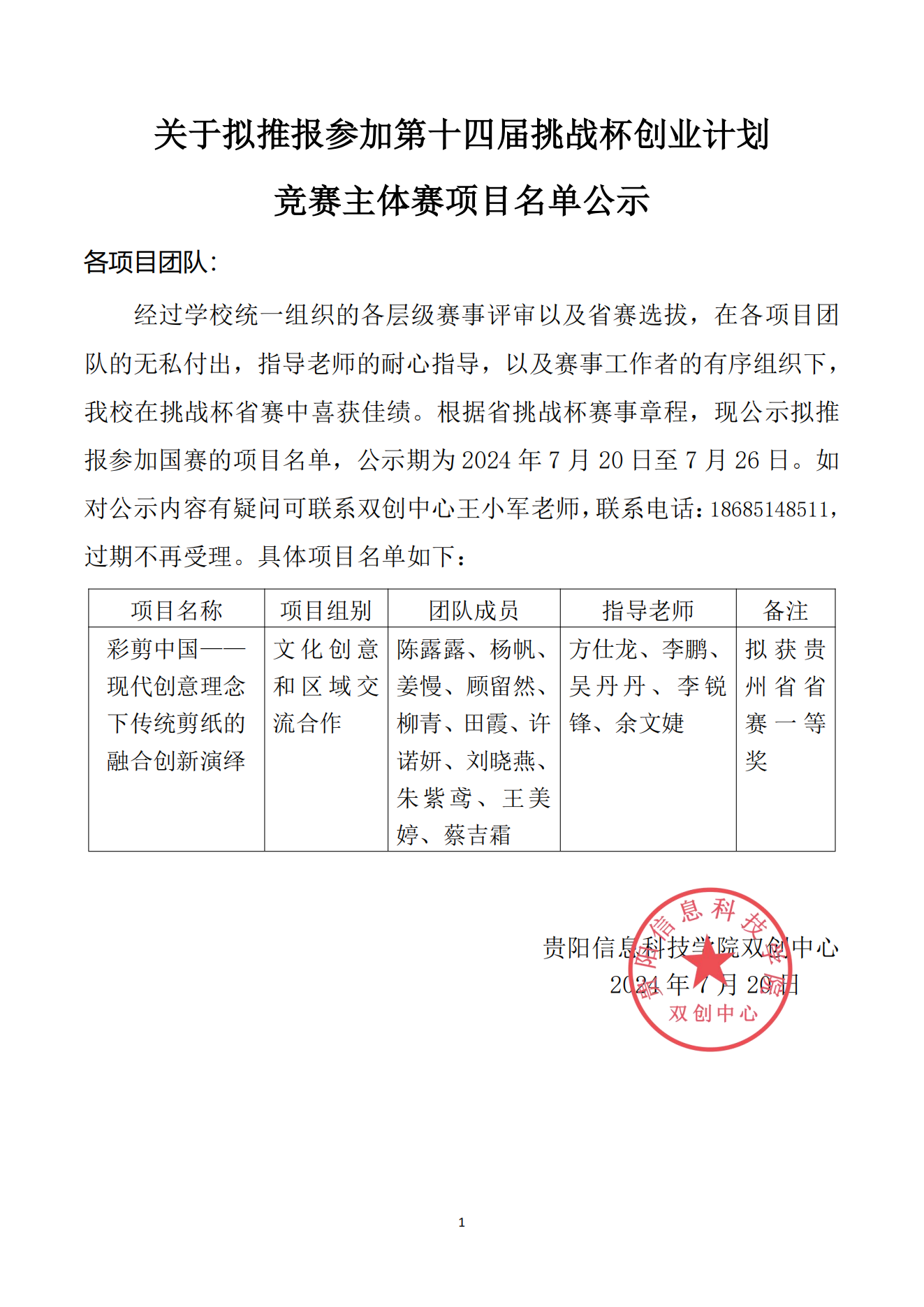 关于拟推报参加第十四届挑战杯创业计划 竞赛主体赛项目名单公示