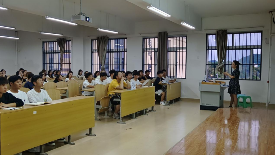 (图为学工办主任黄梦男老师为新生讲解医保、保险、传染病防治工作)