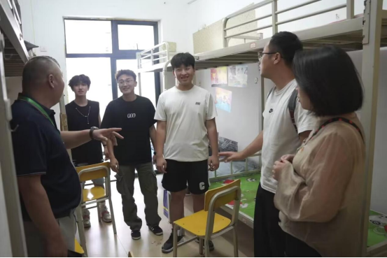 (图为学院王贵禄院长和辅导员进入寝室慰问新生)