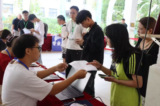 图为志愿者为新生们进行报道注册)