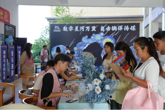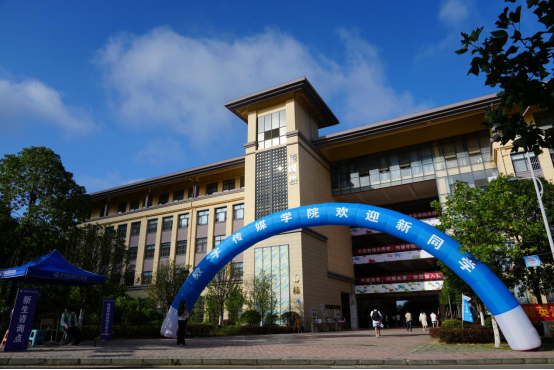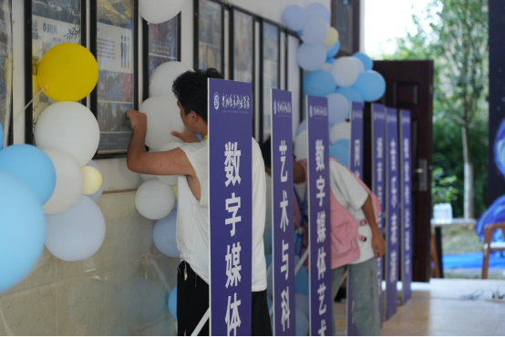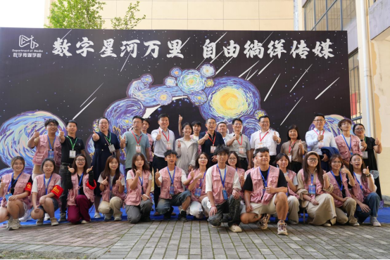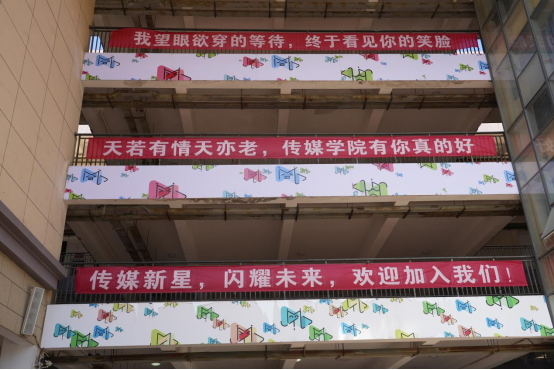 迎新活动开始之前,数字传媒学院在C栋楼下,结合学院特点、专业特色,精心布置了以“数字星河万里,自由徜徉传媒”为主题的迎新场地,一幅幅精心设计的海报、醒目的横幅以及创意十足的新生入学打卡点,营造出浓厚的迎新氛围。
