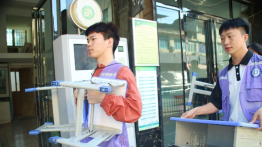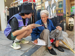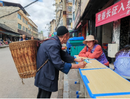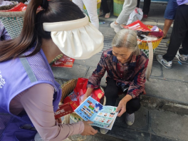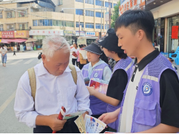街道边,三组队员分头行动,一抹紫色的身影在人流中穿梭,他们身上背负着重要的使命和任务。队员李宏顺向90多岁的爷爷这样说道:“爷爷您好!我们是大学生,来为绥阳郑场的老百姓宣传疾病预防、普法禁毒和反诈知识,这是我们的宣传单,爷爷您平常一定要注意身体,接听陌生电话时要核实信息,不随便相信他人,如拿不定主意,务必要和自己的家人进行反馈,不要被骗了!”