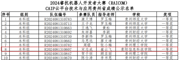 2024 年 10 月 19 日,“2024 年睿抗机器人开发者大赛(RAICOM)” 贵州赛区决赛于贵州师范大学圆满举行。伟德官网信息中心崔云飞、熊溪等老师指导的5名队伍成员,成功在贵州众多高校中斩获一等奖 1项 、二等奖 2 项、三等奖 1 项共4项的优异成绩。伟德官网宋志成、蒙仕翔、况辛龙3位同学成功入围国赛。