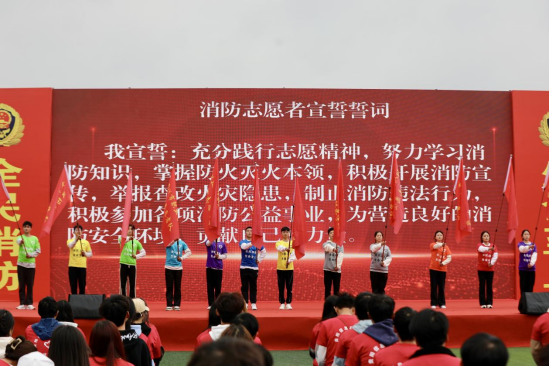 与会嘉宾为15支高校消防志愿者服务队授旗后,高校消防志愿者进行集体宣誓。
