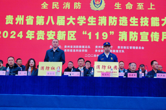 贵安新区管委会党组成员、贵安新区公安局党委书记、局长黄卫讲话并宣布贵州省第八届大学生消防逃生技能大比武暨2024年贵安新区“119”消防宣传月正式启动。