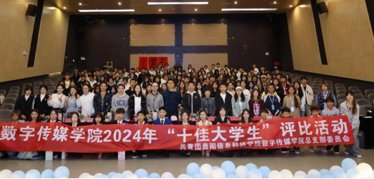 经过评委团地公正打分,综合网络投票,最终,排名靠前的十位选手成功评为数字传媒学院“十佳大学生”。他们分别是播音2201班沈丹、播音2301班袁伟、网新2202班万利来、播音2201班蔡世槿、视觉2202班伍小薇、艺科2101班赵仙、音表2301班陈诗语、视觉2202班夏礼莲、数技2301班刘俪皇和网新2303班吕梦圆。在现场观众热烈的掌声中,李锐锋、杨亮为他们颁发证书并合影留念。