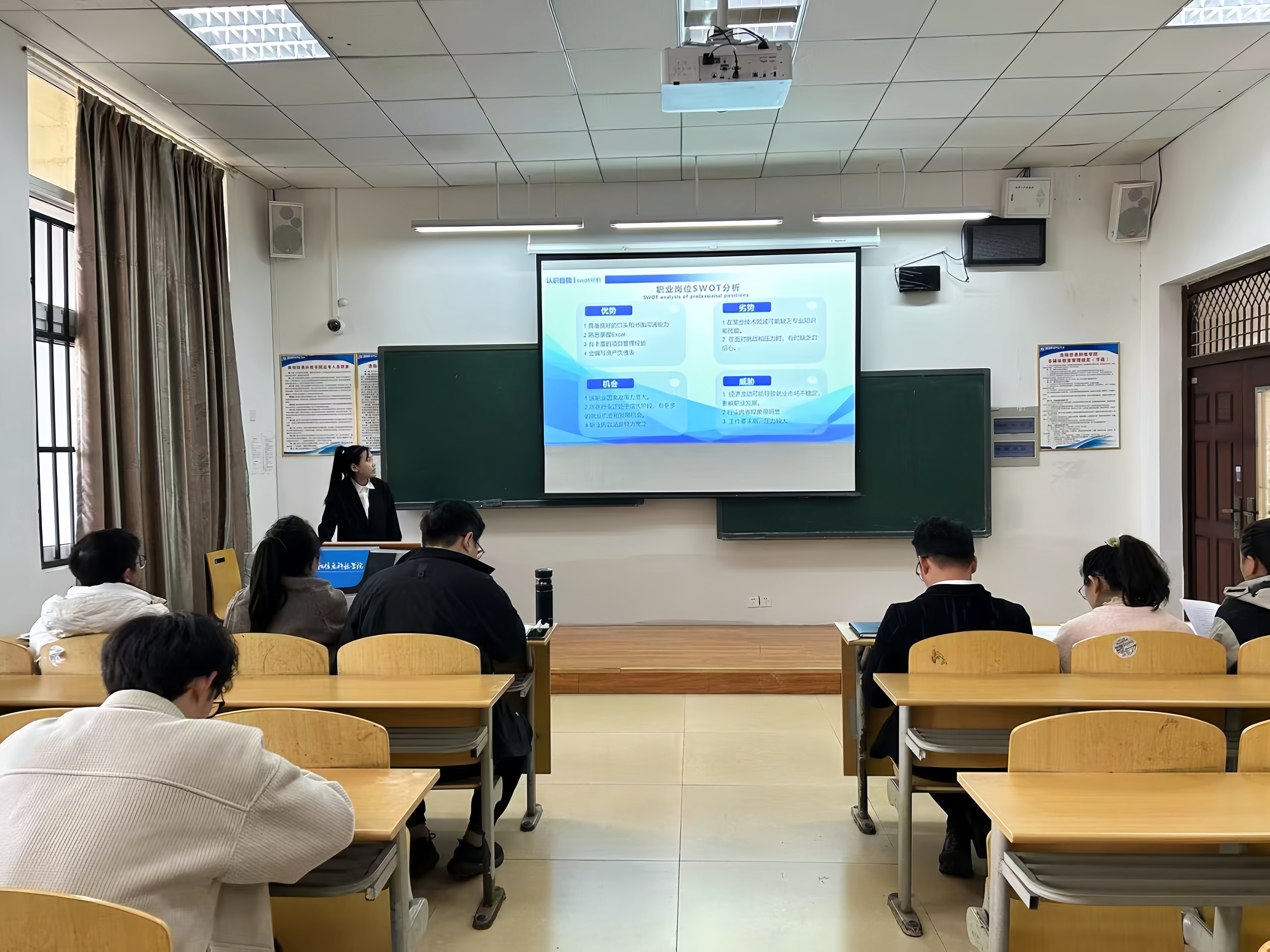 大赛以“筑梦青春志在四方,规划启航‘职’引未来”为主题,分为“成长赛道”与“就业赛道”两大板块,犹如双翼齐飞,为参赛学子提供了广阔的展示舞台。赛前,经济管理学院评审小组以严谨的态度,对参赛者的职业规划书、个人简历等材料进行了细致的审阅,最终筛选出23位佼佼者,晋级初赛进入现场路演环节。