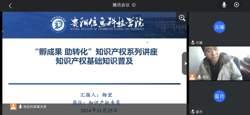 杨宏根据国家知识产权局贵阳办事处近期主办的“国家知识产权局专利局贵阳代办处2024年度知识产权申请注册宣讲专题培训班”的授课知识内容,结合伟德官网师生在日常工作及创新创业活动中遇到的知识产权相关的常见问题进行了统一讲解。