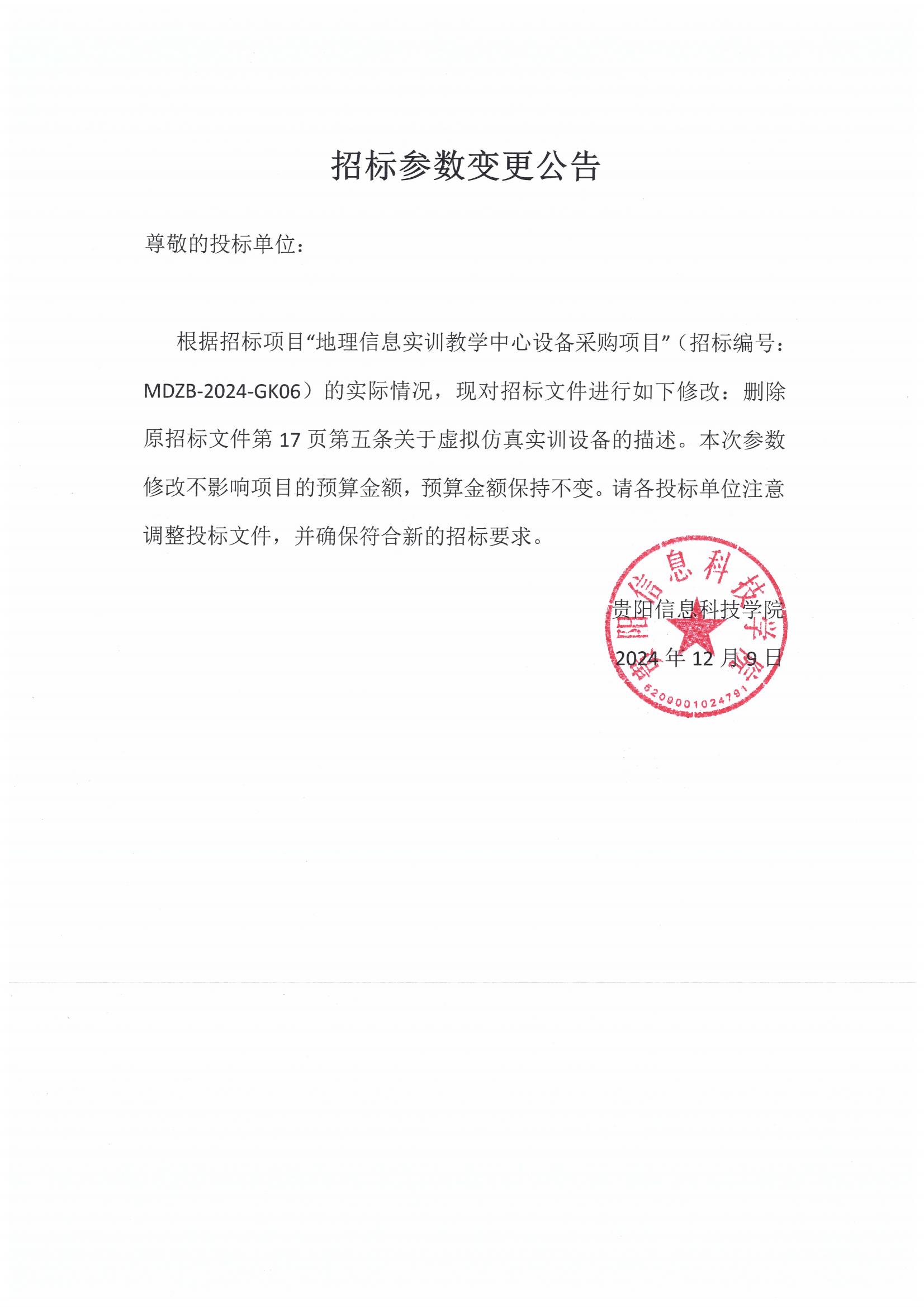 地理信息实训教学中心设备采购项目招标参数变更公告