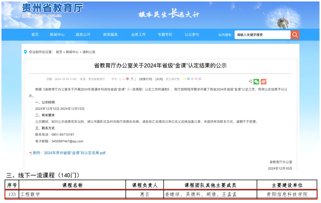近日,省教育厅办公室关于2024年省级“金课”认定结果公示。我部惠芸老师团队的《工程数学》获线下一流课程认定。