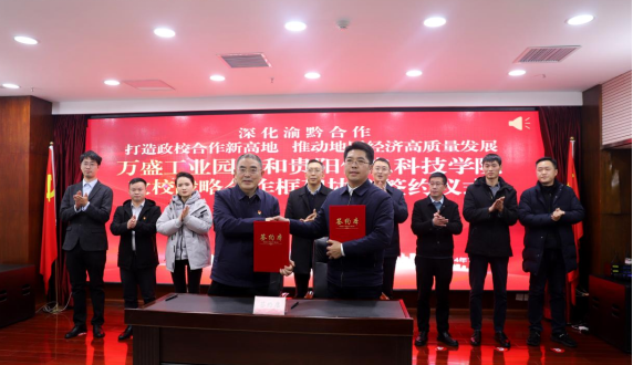 为全面贯彻习近平总书记关于新时代人才工作的新理念、新战略、新举措,深入落实《重庆市人民政府 贵州省人民政府深化战略合作框架协议》精神,充分发挥万盛经开区作为渝黔合作先行示范区的引领示范作用和地方产业资源优势,为毕业生提供充分实习就业机会,助力学校高质量发展,2024年12月26日,学校校长(首席治校专家)唐建荣教授、校党委委员、纪委书记黄晓儒等一行六人前往重庆,在重庆市万盛经济技术开发区工业园区的五楼会议室就深化渝黔区域合作、共筑政校合作新高度进行深入交流并签订政校合作框架协议,万盛经开区党工委委员、管委会副主任涂山全、平山园区党工委书记、管委会主任万春波管委会办公室、科技局、经信局、人社局及福耀玻璃、冠宇电池等十余家重点企业负责人出席会议,会议由万盛经开区平山园区管委会常务副主任罗毅主持。