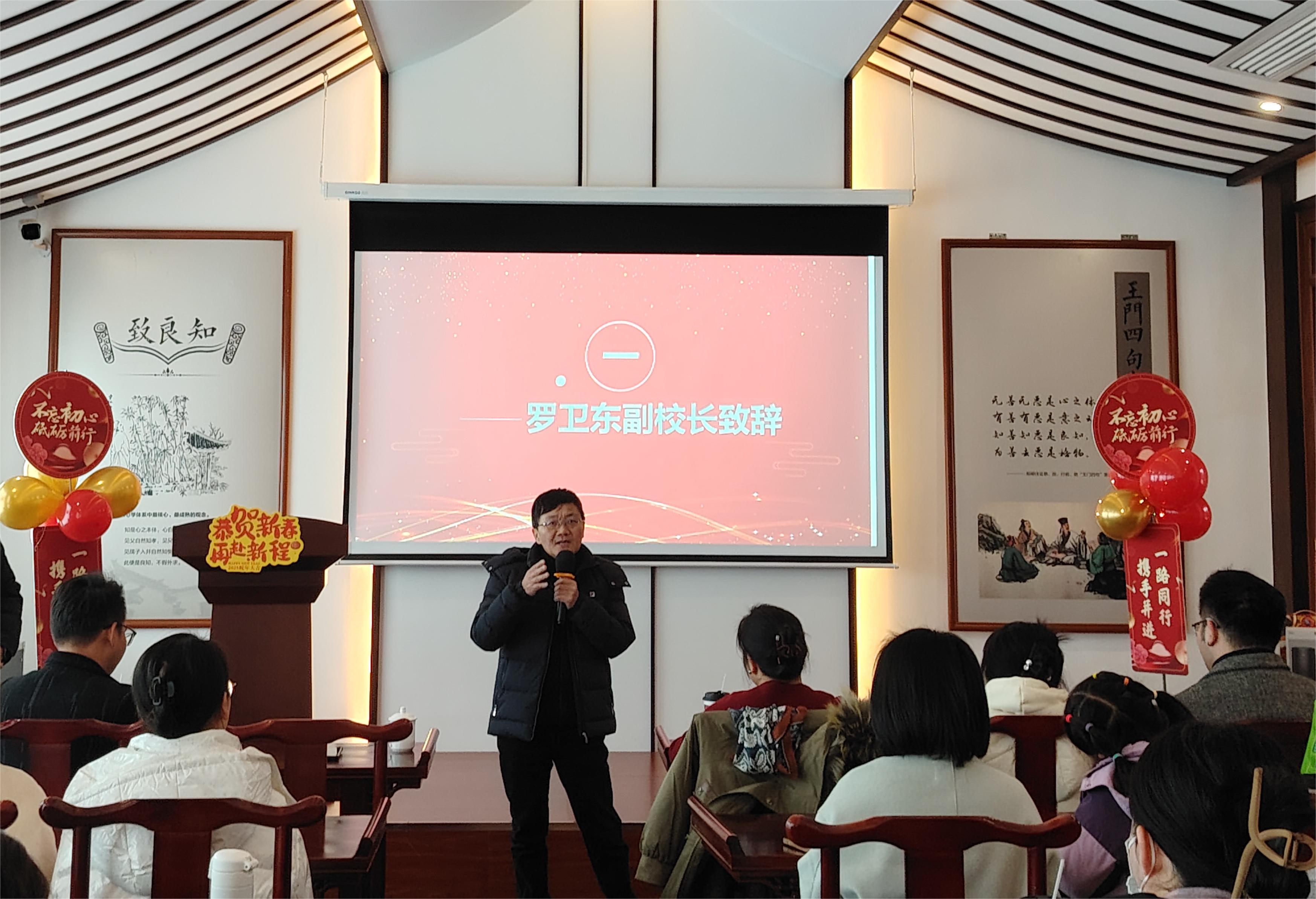 大会在学院学工办主任郭东越热情洋溢的新年祝福中拉开帷幕。学校党委委员、副校长罗卫东莅临会议并发表重要讲话。他对经济管理学院在过去一年中在教学、科研、产教融合等方面取得的显著成绩给予了高度评价,并向辛勤耕耘在教育一线的全体教职工致以诚挚的感谢和崇高的敬意。罗副校长鼓励全体教职工继续发扬砥砺奋进的精神,为学校合格评估和高质量发展贡献力量。