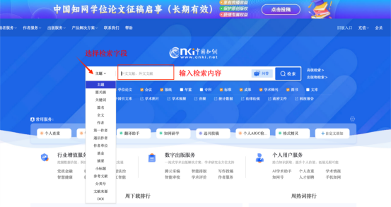 1. 一框式检索,这是知网默认的检索方式,使用一框式检索时首先可根据您的检索需求选择相应的检索字段,如:主题、关键词、篇名、作者、第一作者、通讯作者、作者单位、基金等,再在检索框中输入检索词,点击“检索”即开始在数据库中查找相关文献。