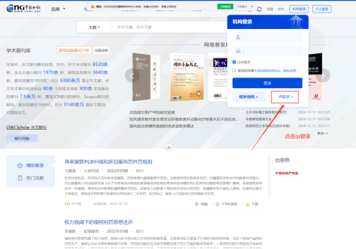 (二)校园网IP范围内,打开中国知网相应数据库主页,网页自动登录机构账号,如未登录机构账号,可以点击IP登录。
