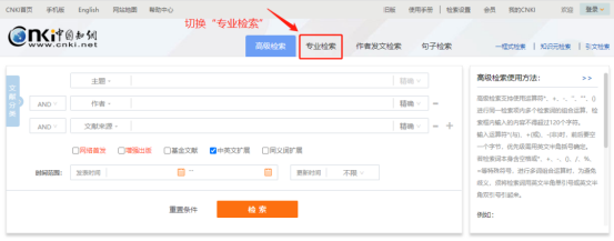 3.专业检索,在高级检索页可切换“专业检索”,专业检索用于图书情报专业人员查新、信息分析等工作,使用运算符和检索词构造检索式进行检索。