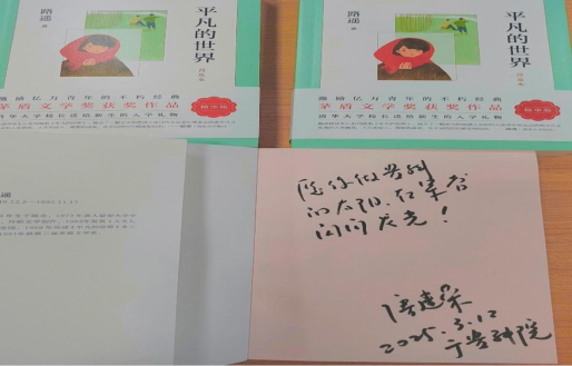 在活动期间,健康管理学院特邀请学校校长唐建荣为3名入伍学子送上我院精心准备的“出征礼”,——路遥经典著作《平凡的世界》,书籍封面上赫然印有校长亲笔题写的寄语:“愿你做贵科的太阳,在军营闪闪发光”,并附签名勉励。唐校长表示:“这本书承载着‘平凡铸就伟大’的精神力量,希望我们踏入军营的贵科学子如书中主人公般坚韧不拔,更要做一束光,用贵科学子的智慧与担当照亮军营、温暖战友。”