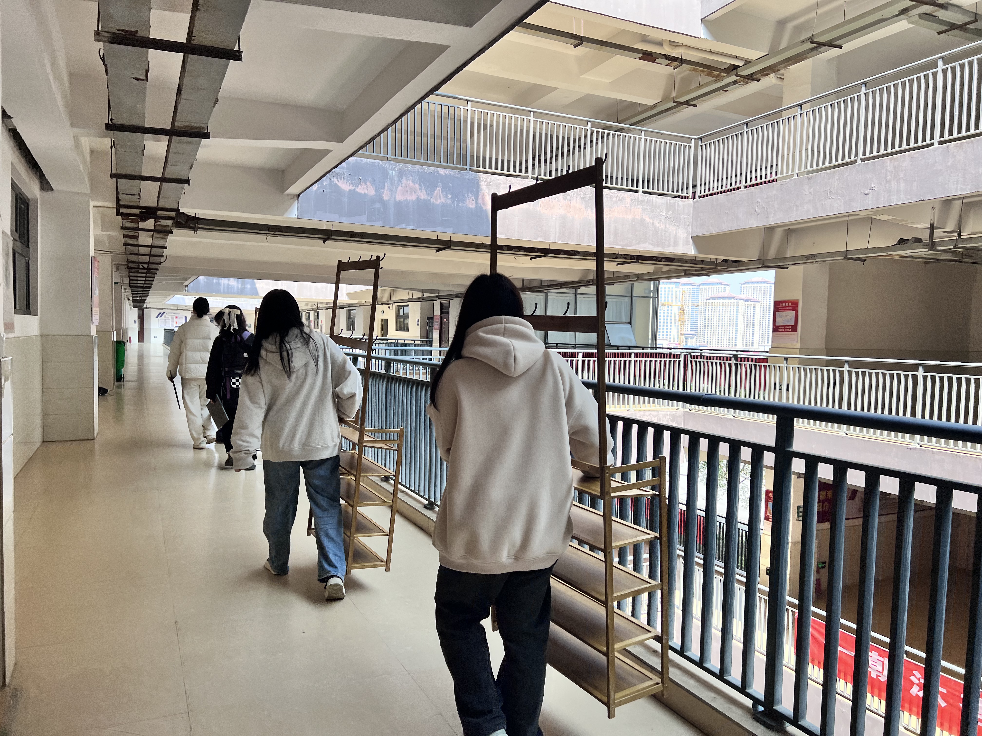 汗水浇灌细节,行动诠释担当。安装当日,成员们化身“校园工匠”:量尺寸、打孔、拧螺丝……走廊里此起彼伏的工具声与欢笑声交织成特殊的乐章。学生会宣传部同学全程跟拍,镜头中的画面令人动容——素拓部同学帮忙调整支架高度,确保伞架不占用通行空间;学生会体育部同学反复测试承重,笑称“要让每把伞都像被同学拥抱一样安稳”。