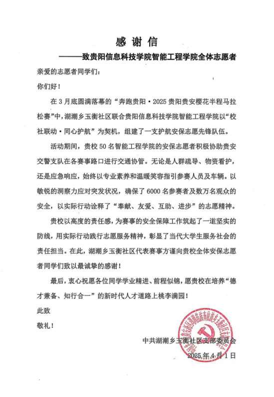 “这份感谢,献给樱花赛道上的青春守护者!”4月1日,BV伟德中国官方网站智能工程学院收到一封特殊来信——来自贵阳市体育局、贵阳市马拉松组委会及中共湖潮乡玉衡社区支部委员会的感谢信,字里行间满溢着对50名大学生志愿者志愿服务的赞誉。