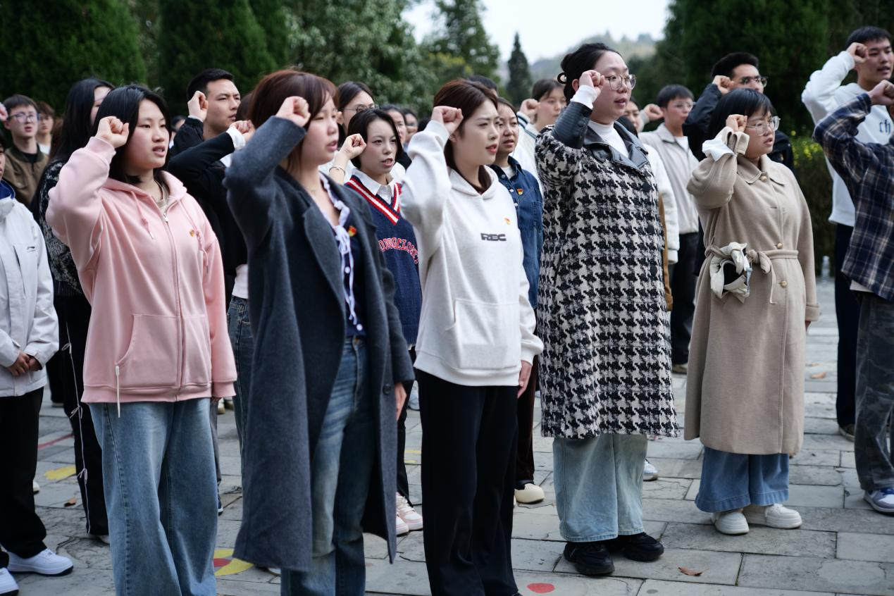 松柏寄情承遗志。师生们手持象征纯洁哀思的白花,轻轻悬挂于苍翠松柏之间,以传统方式表达深切追念,在巍峨的烈士纪念碑前,全体党员庄严举起右拳,重温入党誓词,铿锵誓言彰显了传承红色基因、勇担时代使命的坚定信念。