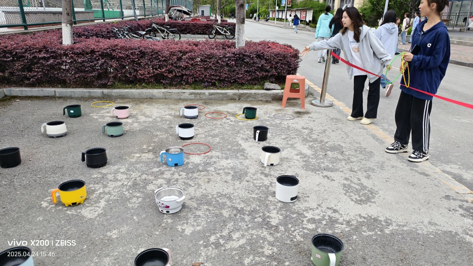 最受欢迎的当“违规电器套圈”游戏区。地上摆放着各类电煮锅的模型,同学们需在套中后准确说出该电器的安全隐患。“这个电煮锅功率是1600瓦,超过宿舍800瓦的限定功率,容易导致线路过载!”在违规电器套圈游戏区,2023级网络与新媒体专业的彭同学准确地说出了刚套中的电器模型的隐患,赢得了阵阵掌声。这个将安全教育与传统游戏相结合的创新环节,成为本次活动最受欢迎的“打卡点”。自管委公寓部部长吕梦圆介绍:“这些看似方便的小电器,在宿舍使用极易引发线路过载、短路甚至火灾,我们必须防患于未然。”