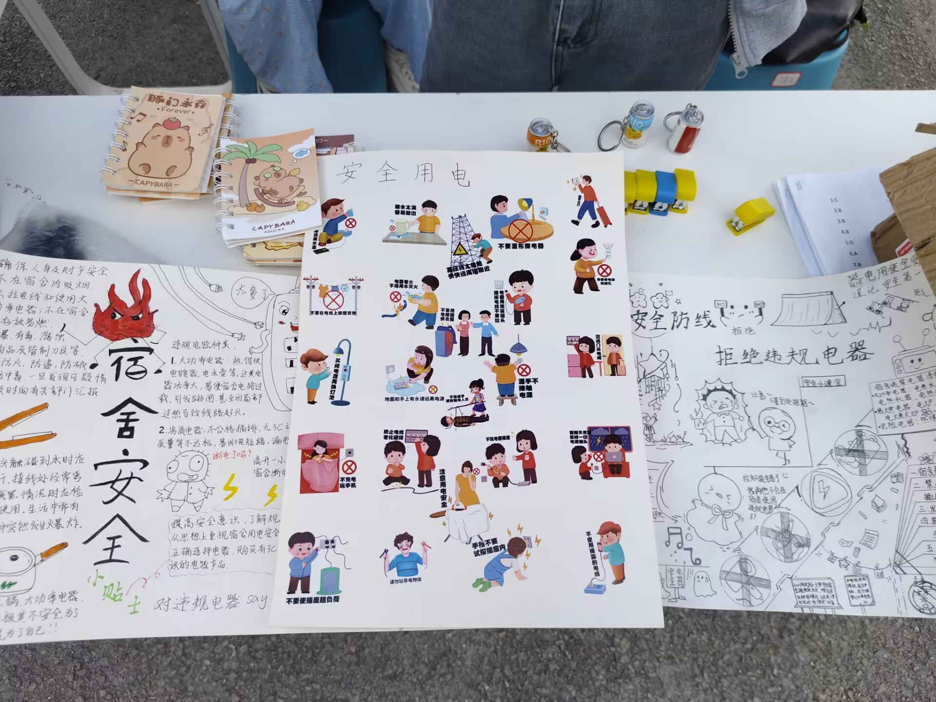 活动现场划分为三个特色区域。在手抄报展示区,多幅由各个学生精心制作的安全教育手抄报依次排开,内容涵盖电器使用规范、应急处理措施等。