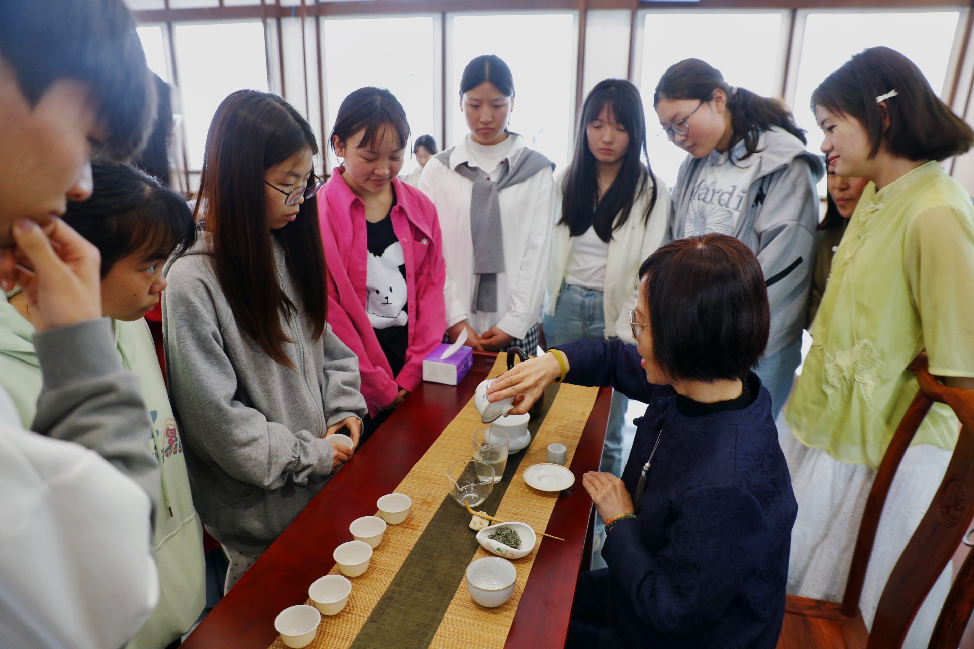 实践环节将活动推向高潮。在屠老师指导下,师生们亲手体验了绿茶冲泡的“凤凰三点头”经典技法。同学们初次尝试盖碗冲泡,动作略显生涩,却专注异常:从水温控制到出汤节奏,每个细节都蕴含着古人的智慧,这比书本上的知识更令人难忘。