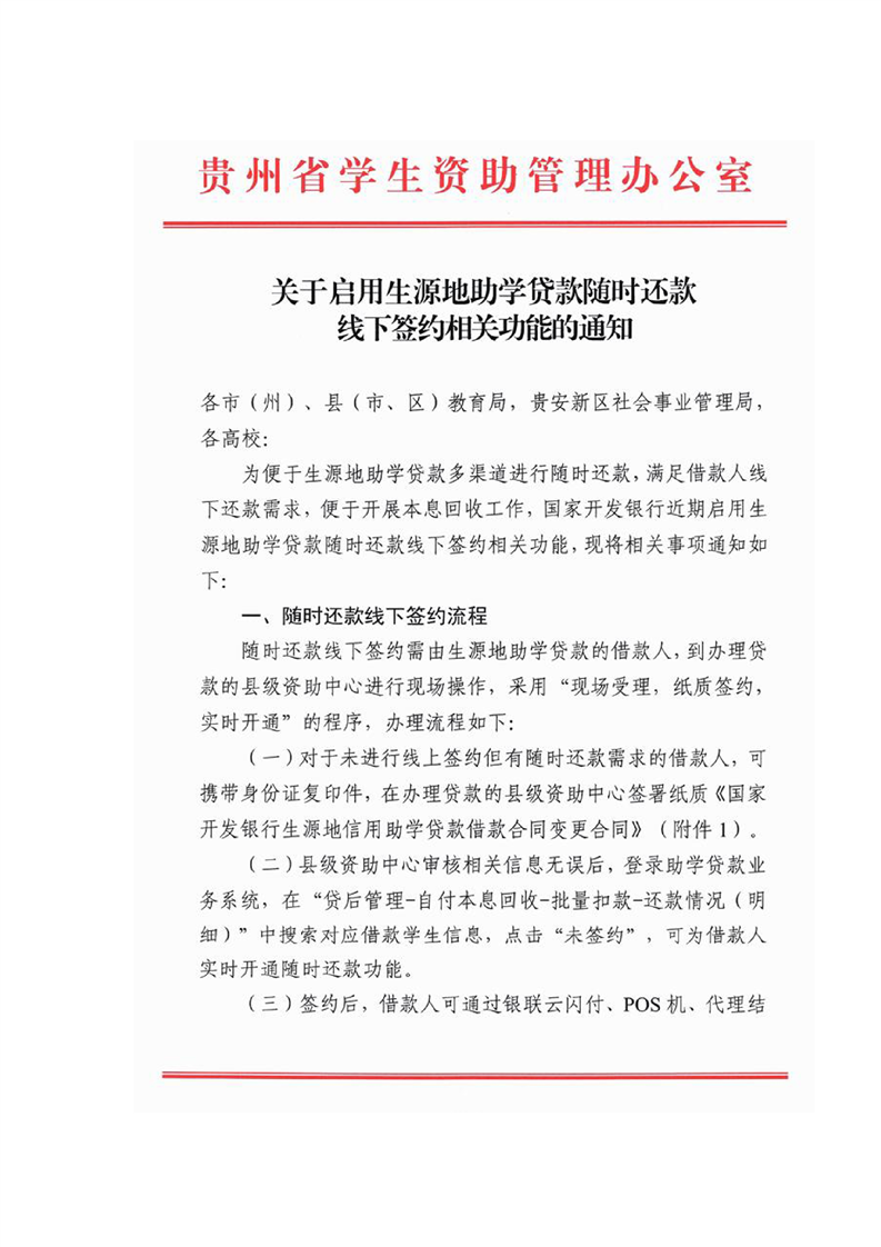 关于启用生源地助学贷款随时还款线下签约相关功能的通知