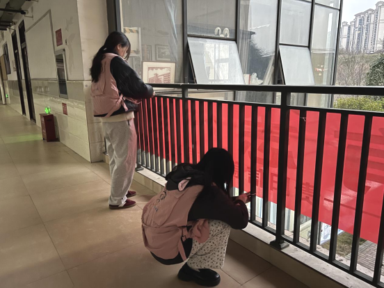 “再往左一点,对齐墙的边框!”在学院三楼廊道,学生会成员正张贴关于学风建设的标语。他们手持“学海无涯勤作舟,青春有志行致远”的横幅标语,将其精心装裱上墙;另一组同学则在教室门框处粘贴卡通标语牌,旁边的Q版卡通人为“垃圾不落地、校园更美丽”的提示语增添了几分活力。这些标语不仅给教学楼增添艺术风采,对同学们的生活、学习环境都起到潜移默化的作用。