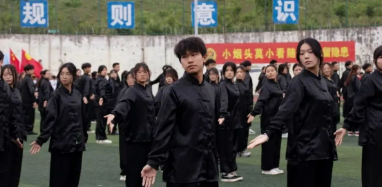 马克操方阵以排山倒海之势涌入场地,刚劲有力的搏击动作与电子音效构建的脉冲节拍形成共振,训练有素的运动员们踏着鼓点跃动,宛若数字时代泼墨挥毫的青春画卷在体育场铺展;啦啦操队员伴随着激昂的节拍,以灵动的跳跃和飞扬的舞步,尽情释放青春激情;八段锦表演队行云流水般展开队形,传统养生功法在现代编舞中焕发新生,演员们身着渐变水墨长袍,起势时如松揽云,推掌处若鹤唳风,刚柔相济的招式间既保留着古韵悠长的吐纳之道,又暗合现代运动科学的人体力学原理,构成传统与现代对话的立体美学空间……