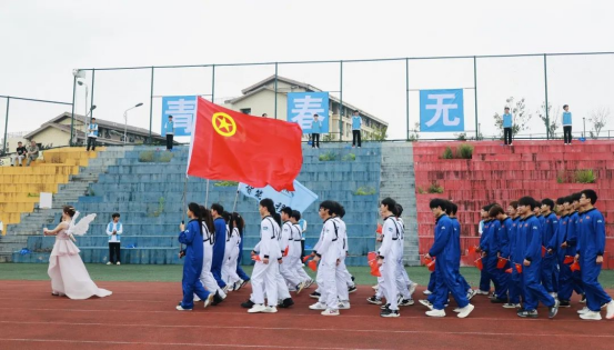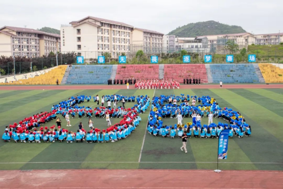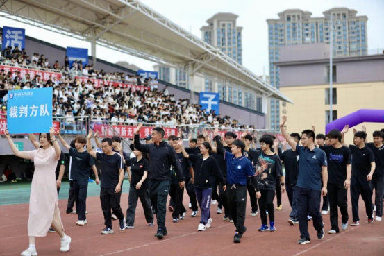 青年志愿者协会的同学们带来的开场表演,活力四射、动感十足,他们灵活地变换着队形,动作流畅而精准。眨眼间,队伍化作了熠熠生辉的校徽,彰显着校园文化;转瞬间,又排列成乒乓球拍、跳高栏等,这些动态的图形不仅是对运动会项目的生动演绎,更将竞技精神与志愿风采完美融合。