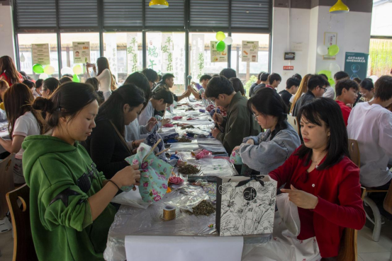 活动伊始,艾草的独特清香便弥漫开来。在艾草养生捶制作区,同学们在工作人员的示范下,兴致勃勃地将晒干的艾草叶小心翼翼地填充进特制的棉布袋中。随着木柄的安装与棉绳的缠绕固定,一个个兼具实用与美感的艾草养生捶在同学们手中诞生。大家互相交流着制作心得,了解着艾草温经通络、驱邪避秽的传统养生智慧。