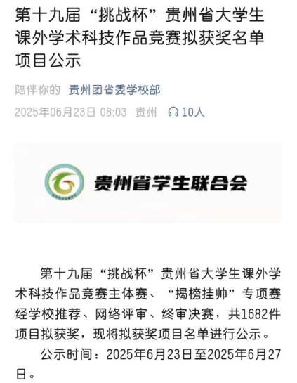 6月23日,贵州团省委公布第十九届“挑战杯”贵州省大学生课外学术科技作品竞赛省赛获奖名单,伟德官网共52个项目斩获奖项,其中,一等奖3项、二等奖2项、三等奖47项,在项目总量和金铜数量上都突破了历史性最好成绩。