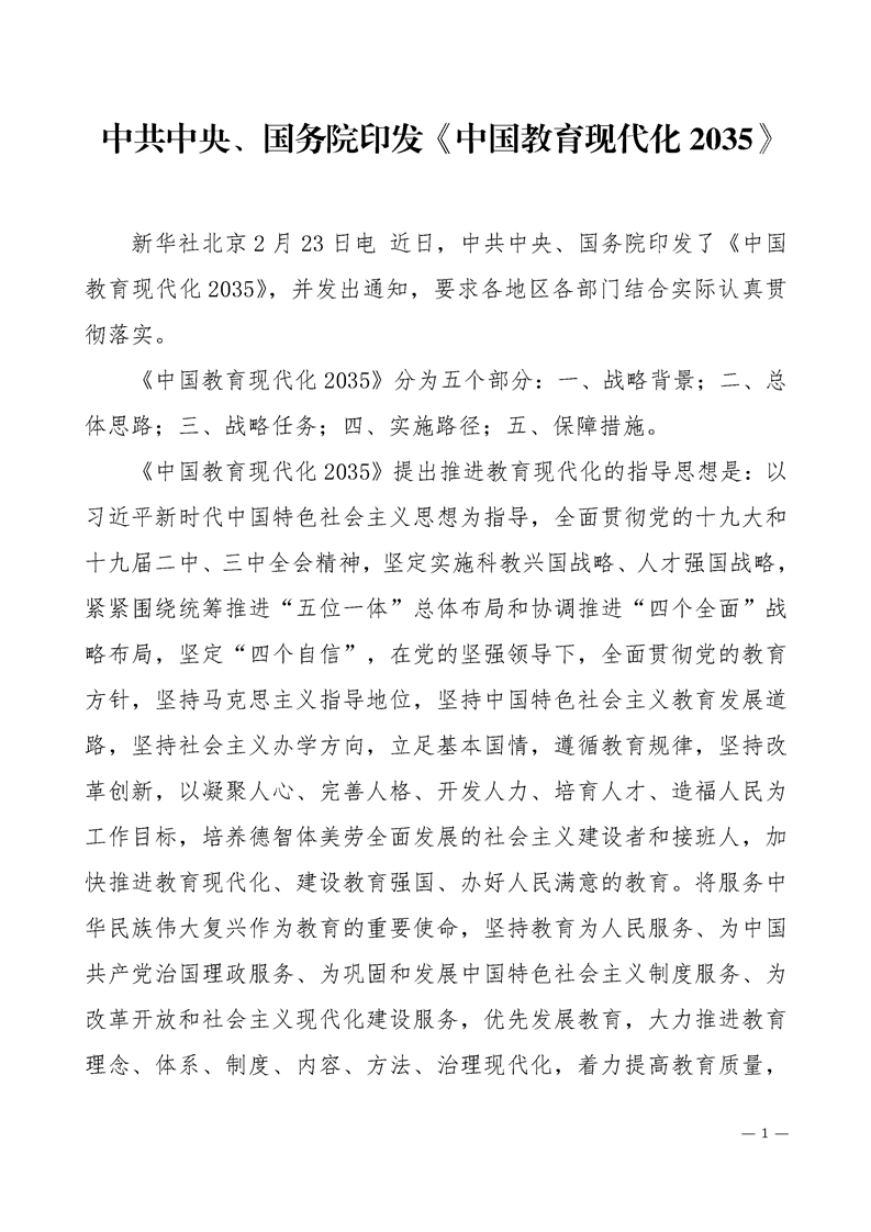 中共中央、国务院印发《中国教育现代化2035》