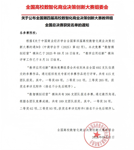 全国第四届高校数智化商业决策创新大赛是贯彻落实国务院《“十四五”数字经济发展规划》中“推进智慧教育、促进数智化技术与教育深度融合”要求的重要赛事,是全国普通高校教师教学竞赛清单赛事之一,由中国商业经济学会主办,赛事规格高、专业性强,在全国高校数智化商业教学领域具有广泛影响力与权威性。比赛分为“教学应用创新”和“数智模拟经营”两个模块,其中邱艳萍老师参加的教学应用创新模块吸引了来自全国692支教师团队参与角逐。经专家评审,共评选出一等奖69项、二等奖141项、三等奖205项。