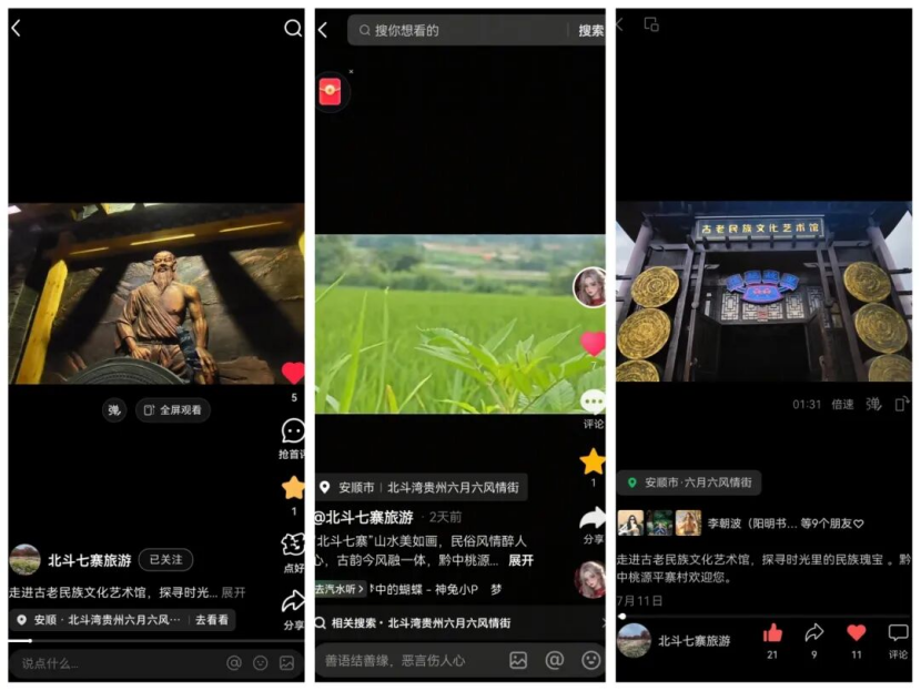 图为:师生帮助平寨村搭建并运营的抖音、小红书、视频号文旅账号:北斗七寨旅游