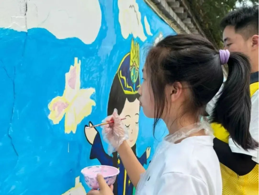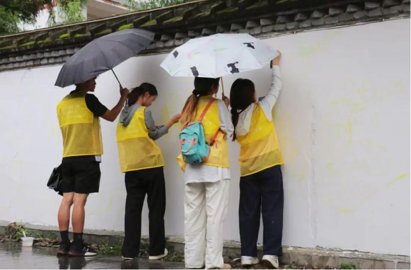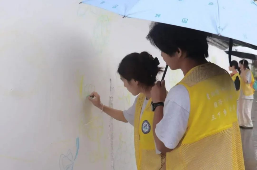 在墙绘绘画的过程中,有很多难忘的的经历,其中最难忘的是墙绘团队经历了大雨倾盆,但为保障项目进度,队员们密切关注天气变化,在雨势稍缓的间隙迅速行动继续绘画。在雨中队员们手持雨伞遮蔽墙面与工具,在湿滑的环境中继续进行构图调整;雨水虽打湿了衣服与画具,但却丝毫未动摇队员们的工作热情,伞下专注的身影成为雨中一道独特的风景线。雨中绘画的场景充分展现了实践队员们不畏艰难、高效协作的团队风貌。