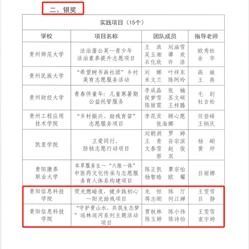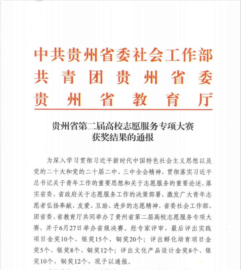 近日,贵州省第二届高校志愿服务专项大赛获奖结果正式公布,伟德官网师生团队凭借扎实的志愿服务实践项目与独具匠心的文化产品设计,在众多参赛作品中崭露头角,斩获3项银奖、2项铜奖的亮眼成绩,生动诠释了伟德官网学子昂扬向上的志愿精神与卓越的实践能力!