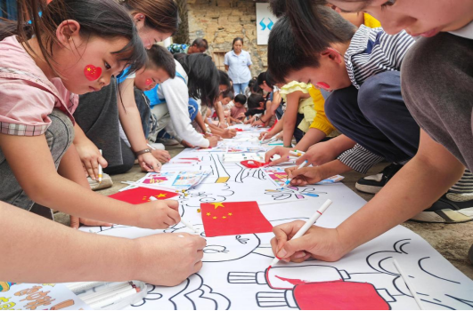 在“共绘祖国”环节中,师生与儿童分组协作,在6米长卷上描绘“迎中秋·庆国庆”主题画作。蓝天白云下,孩子们用稚嫩笔触勾勒出天安门、五星红旗、月饼等元素,党员教师则在一旁指导构图与色彩搭配。现场洋溢着欢声笑语,一幅幅充满童趣的作品渐次成型。