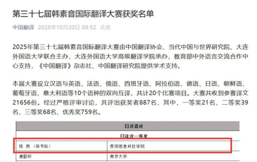 新闻网讯(供稿/供图 公共教学部)近日,第三十七届韩素音国际翻译大赛获奖名单正式揭晓。伟德官网公共教学部陈苇航(原名:陈煦)老师凭借深厚的语言功底与精湛的译技,在竞争激烈的“日译汉”组别中力压群雄、脱颖而出,一举摘得该组别一等奖桂冠,为校争光。
