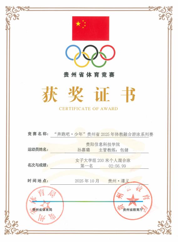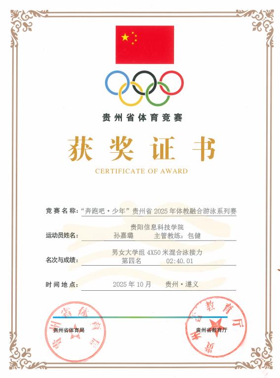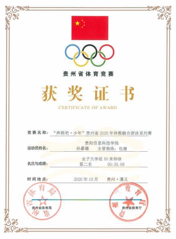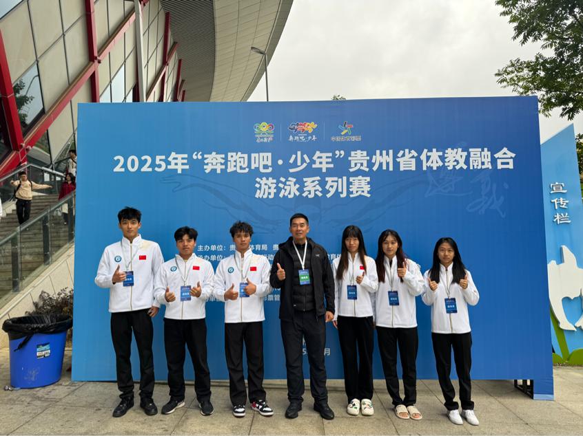 10月24日,2025年“奔跑吧,少年”贵州省体教融合系列赛游泳比赛开赛。这场汇聚全省游泳新秀的激烈角逐中,由公共教学部唐丽华老师担任领队,包健、李建两位老师联合指导的6人小队—孙嘉璐、刘粒、杨愿、王胤喆、罗光记、韦团上,凭借扎实的技术功底与顽强的拼搏精神,在碧波池中镌刻下属于青春的热血印记。