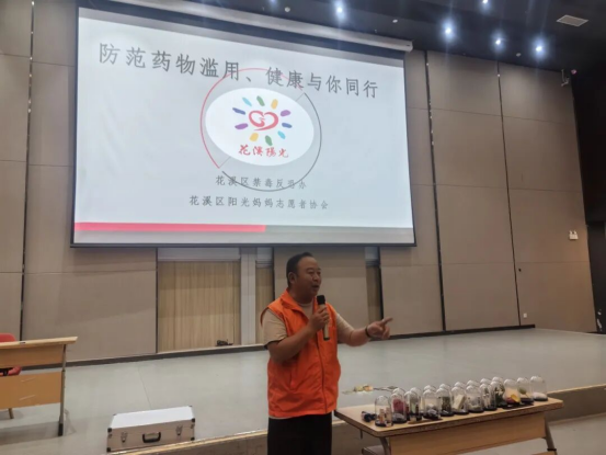 最后,来自花溪区灵秀社会工作服务社的黄超老师以“防范药物滥用,健康与你同行”为主题,开展毒品知识宣传。
