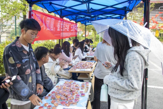 活动现场,工作人员提前准备好了包装精美的月饼,内有蛋黄莲蓉、经典豆沙等多种口味,充分满足同学们的不同喜好。现场秩序井然,同学们自觉排队,接过这份承载着心意的月饼。轻松愉快的交谈声此起彼伏,温馨的节日氛围包裹着每一个人。
