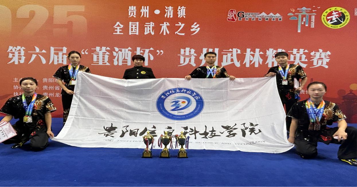 师生们身披奖牌、手持校旗,在第六届“董酒杯”贵州武林精英赛背景板前留下光荣印记,奖杯与证书辉映出奋斗的光芒。